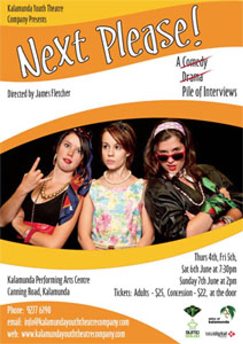'Next Please' is a play dealing entirely with the situations and problems that can arise during an interview. Ingeneously developed and directed by James Fletcher, the show is made up entirely of scenes that are interviews of all kinds. From a woman interviewing bands for her wedding to a job interview, we follow a range of characters through this thought-provoking show that makes us wonder what we would do next time we hear, 'next please!'.