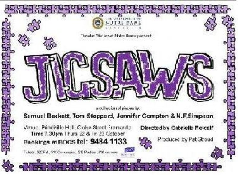 The third year Production and Theatre Crafts students of the University of Notre Dame, Fremantle, present "Jigsaws - An Absurdist Mix". Directed by Gabrielle Metcalfe and produced by Pat Stroud.