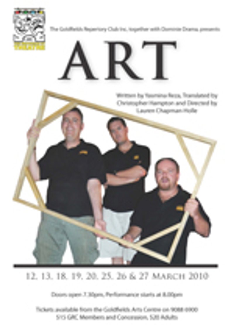 Art opens on Friday, 12 March 2010, for a three week season. Tickets are now on sale from the Goldfields Arts Centre. $20 Adults, $15 GRC Members and Concession. Call the Box Office on 9088 6900 between 10am and 3pm, Monday to Friday, to ensure you don't miss out!