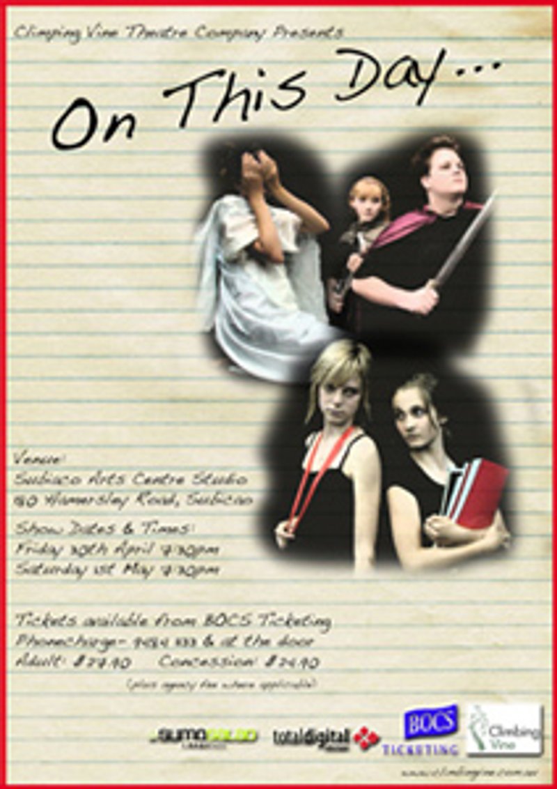 On This Day is a production about how suddenly our lives can change and how quickly we can find that everythying is different - or that we are. Three short pieces combine into one performance on the theme "On this day, everything changed..." , to examine how we deal with change and those changes shape us into who we are. Directed by Paul Quartermain and the member of our new Vision program for young directors, Matthew Buss. This show will allow our Foundation and Clockwork students to debut in a vibrant and well-developed performance.