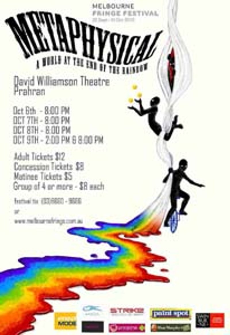 As part of the 2010 Melbourne Fringe Festival, Metaphysical takes you on a journey to the weird and wonderful world at the end of the rainbow. This visual story follows the pursuit of one shadows freedom and happiness, in a place where all is not as it seems. Come with us as we explore the world of Metaphysical and its bizarre characters in this unique physical theatre performance.