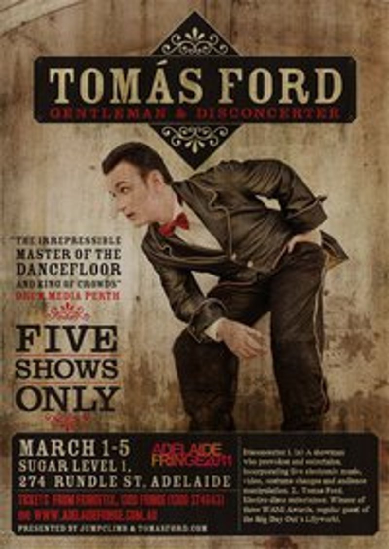 This years’ Adelaide Fringe will see Ford hit town for five nights only, premiering his new show Gentleman & Disconcerter; an electro cabaret designed to provoke and flood the senses with glowing costumes, video effects and his patented unpredictable showmanship. For more information and music, head to http://tomasford.com/ or http://myspace.com/tomasford.