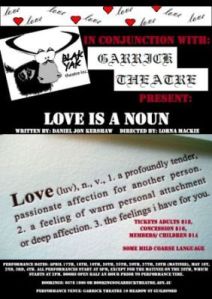 Love Is A Noun is a black comedy by award-winning playwright Daniel Jon Kershaw. It is a bittersweet elegy charting different perspectives of love. Underneath the lives of the characters simmers a world completely dominated by expectations of love failed or otherwise.
